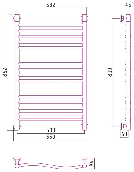 Межосевое расстояние: - нижнее подключение X (мм) 500 - диагональное подключение Y (мм) 800 - вертикальное подключение Y (мм) 800 Внешние габариты (высота х ширина х глубина) (мм) 862 х 550 х 84 Подключение Универсальное Материал Нержавеющая сталь AISI 304 L (04X18H10) Площадь помещения (м2) 5 Объем помещения (м3) 12.5 Теплоотдача (Qвт) 497 Рабочее давление от 3 до 15 атм Давление испытаний 60 атм Температура теплоносителя до 105°С Масса (кг) 7.7 Объем (м3) 0.033