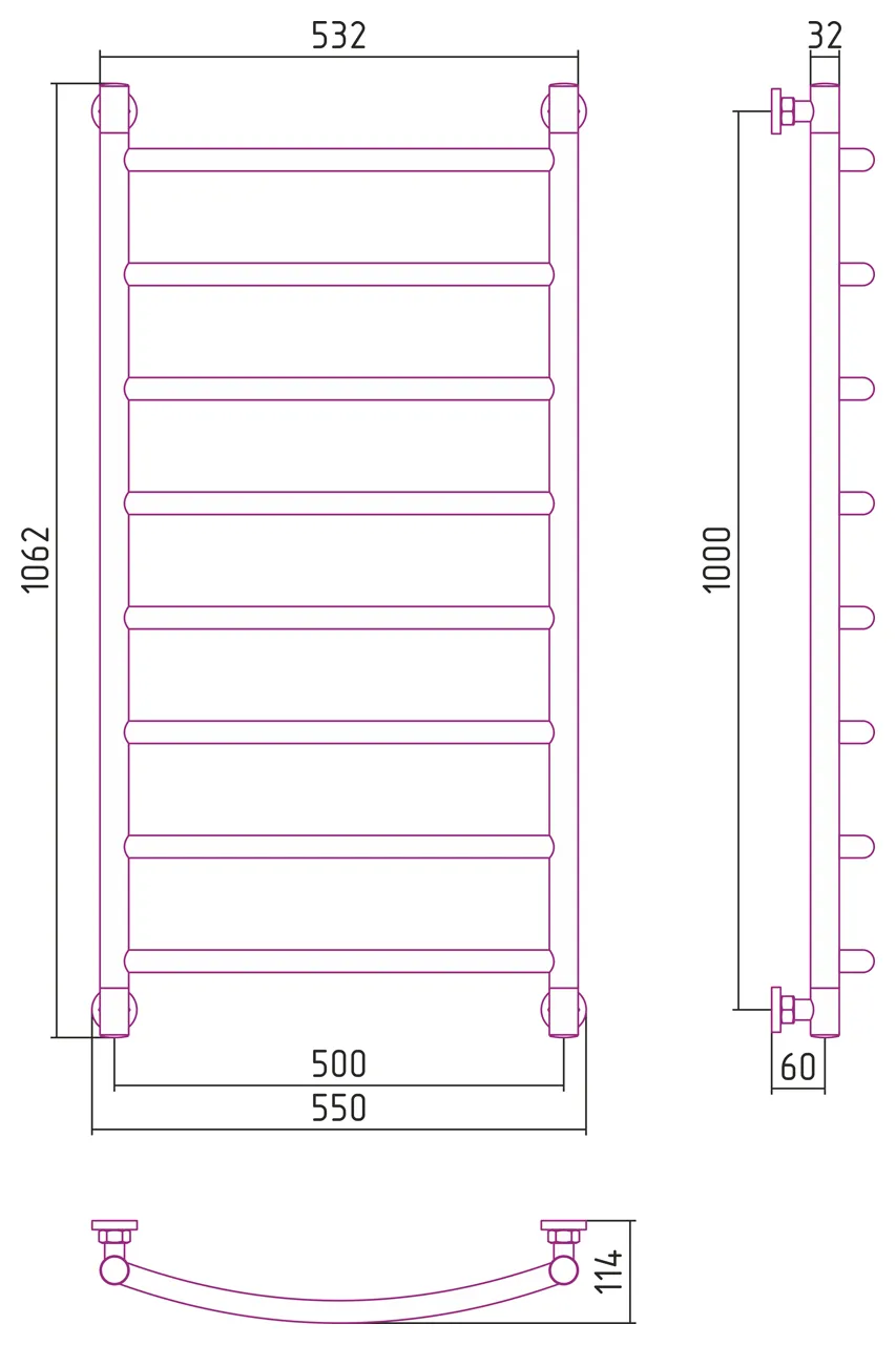 Межосевое расстояние: - горизонтальное подключение X (мм) 500 - диагональное подключение Y (мм) 1000 - вертикальное подключение Y (мм) 1000 Внешние габариты (высота х ширина х глубина) (мм) 1062х550x114 Подключение Универсальное Материал Нержавеющая сталь AISI 304 L (04X18H10) Площадь помещения (м2) 4.4 Объем помещения (м3) 10.8 Теплоотдача (Qвт) 433 Рабочее давление от 3 до 15 атм Давление испытаний 60 атм Температура теплоносителя до 105°С Масса (кг) 7.080 Объем (м3) 0.047