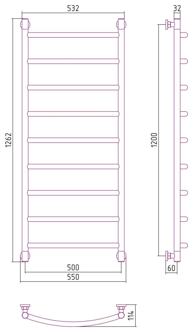 Межосевое расстояние: - горизонтальное подключение X (мм) 500 - диагональное подключение Y (мм) 1200 - вертикальное подключение Y (мм) 1200 Внешние габариты (высота х ширина х глубина) (мм) 1262х550x114 Подключение Универсальное Материал Нержавеющая сталь AISI 304 L (04X18H10) Площадь помещения (м2) 5.1 Объем помещения (м3) 12.6 Теплоотдача (Qвт) 502 Рабочее давление от 3 до 15 атм Давление испытаний 60 атм Температура теплоносителя до 105°С Масса (кг) 8.740 Объем (м3) 0.056