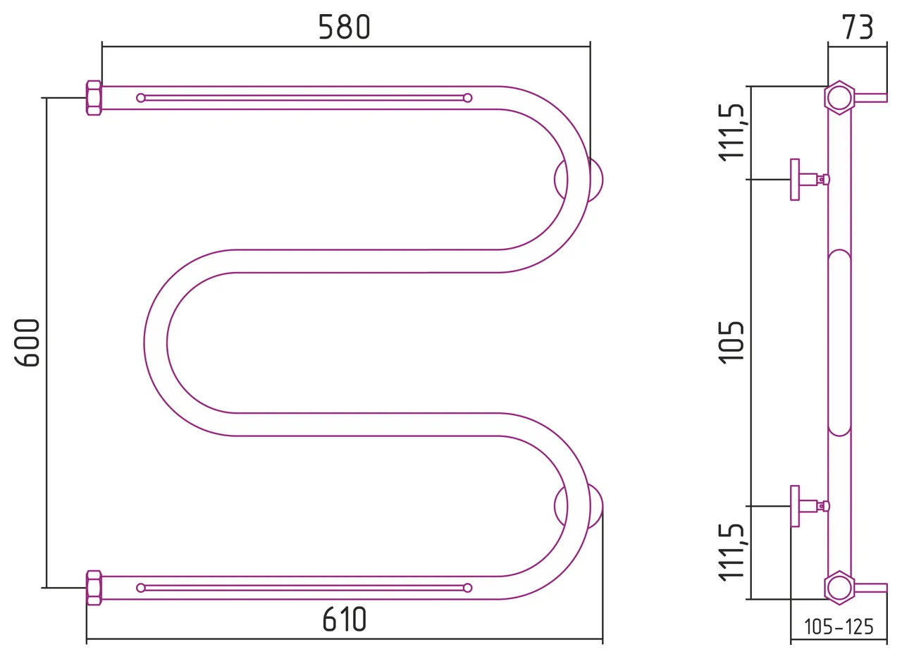 Технические характеристикиТип: Полотенцесушитель водянойБренд: СунержаМодель: М-образныйМатериал: Нержавеющая сталь AISI 304 L (04X18H10)Цвет: 00 Без покрытияВнешние габариты - высота (мм): 630Внешние габариты - ширина (мм): 605Межосевое расстояние по Y: 600Страна производителя: РоссияГарантия (лет): 7Защита от блуждающих токов: Без защитыРазмер: 600х600Подключение: Накидная гайка G 1"Присоединительный размер: 1" н. г.Высота (мм): 600Давление при испытаниях: 60 атмМасса (кг): 3.28Объем (м3): 0.035Объем помещения (м3): 4.7Площадь помещения (м2): 1.9Рабочее давление: от 3 до 15 атмТемпература теплоносителя: до 95°СТеплоотдача (Qвт): 185Ширина (мм): 600