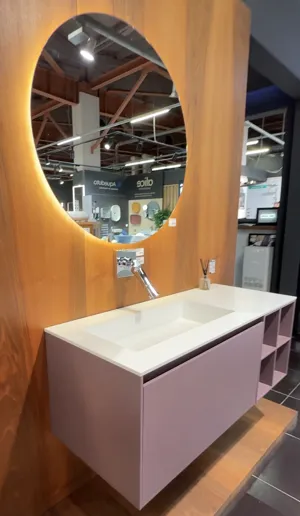 BRENTA Коллекция Fly Тумба с раковиной 1200 (800+400)х500хh445 мм, ящик с подсветкой, цвет Mokka Mat. Материалы и отделка: Толщина фасадов и боковин - 10 мм Столешница из 12 мм, искусств.камень Solid Surface. Внешняя отделка представлена: ⦁ Эмаль, покрытая матовым лаком Функциональные детали: ⦁ Встроенная внутренняя подсветка тумбы