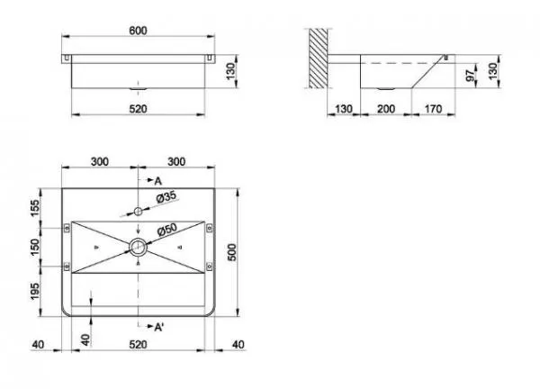 - Размеры: 130 высота x 600 ширина x 500 глубина (мм)