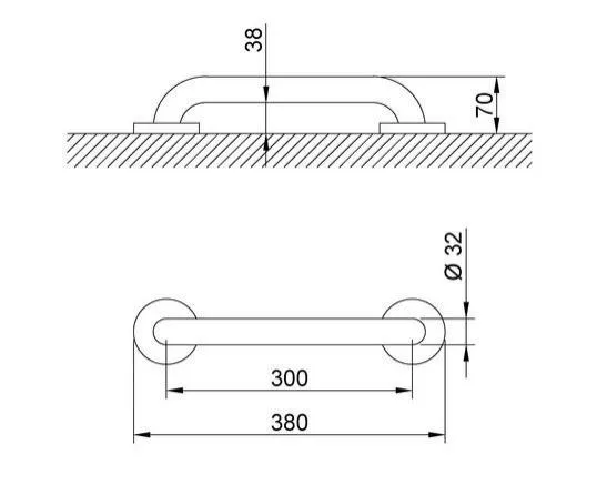 Изготовлен из нержавеющей стали AISI 304. Две опорные точки. Длина (между центрами опор): 300 мм. Диаметр Ø 32 мм, толщина 1,5 мм. 38 мм от стены. Рекомендуемая высота установки 70-75 см от пола. Крепления включены в комплект.