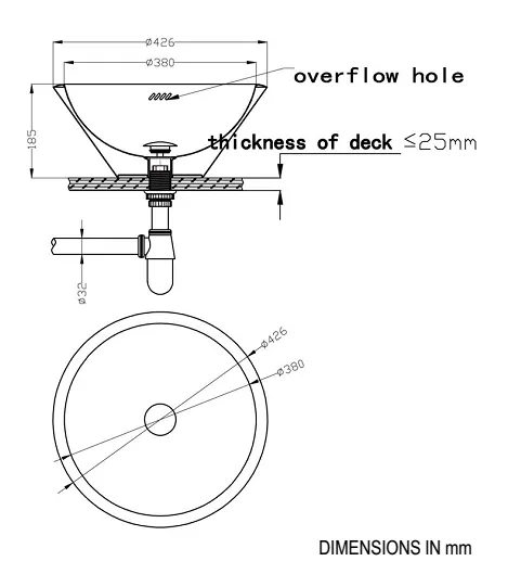 Стильный умывальник выполнен нержавеющей стали AISI 304 с отверстием от перелива, выполненым в виде 4 прорезов