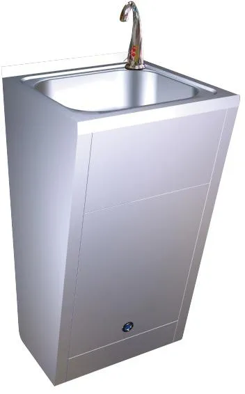 Напольная раковина с пьедесталом и смесителем сенсорным изготовлена из особого сорта нержавеющей стали AISI 304, что обеспечивает долгий срок её службы. Умывальник считается антивандальным, т.к не имеет острых углов, а стенки корпуса из нержавеющей стали толщиной 1,2 мм надежно защищают его от ударов..Умывальник с автоматическим сенсором, благодаря которому начинается подача воды, которая в свою очередь автоматически закончится через 15 секунд. Также в комплект входят сливной клапан, кран.