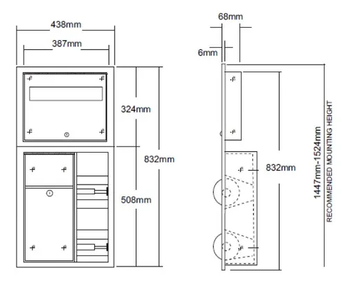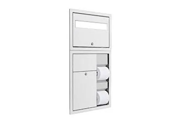 Компактный встраиваемый шкаф выполнен из нержавеющей стали AISI 304, что обеспечивает очень долгий срок его службы, защиту от коррозии и ржавчины и высокую прочность. В устройства входят: два держателя для туалетной бумаги, съёмный контейнер для отходов и диспенсер накладок для туалета, для диспенсера туалетных накладок и контейнера для мусора имеется универсальный ключ в комплекте. Для установки встраиваемой мебели вам потребуется сделать отверстие в стене, глубиною около 11 сантиметров. Подобный вид оборудования сделан для мест с большой проходимостью, в которых не так уж и много свободного пространства в санузле. Компоновка диспенсеров, держателей и ведра для отходов позволяет сэкономить довольно много места в туалетной комнате. Гарантия на эту модель предоставляется в течение первых двух лет использования.
