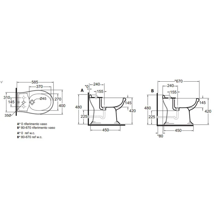 Биде напольное приставное Azzurra Jubilaeum 59x40см с 3 отв под смеситель, белый с креплением к полу JUBIT000000TBI/(JUB510/T bi)*3