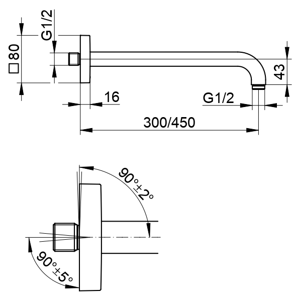 Из стены G 1/2, с квадратным отражателем, возможность выравнивания к стене (90° ± 2°) и к подключению в стене (90° ± 5°)