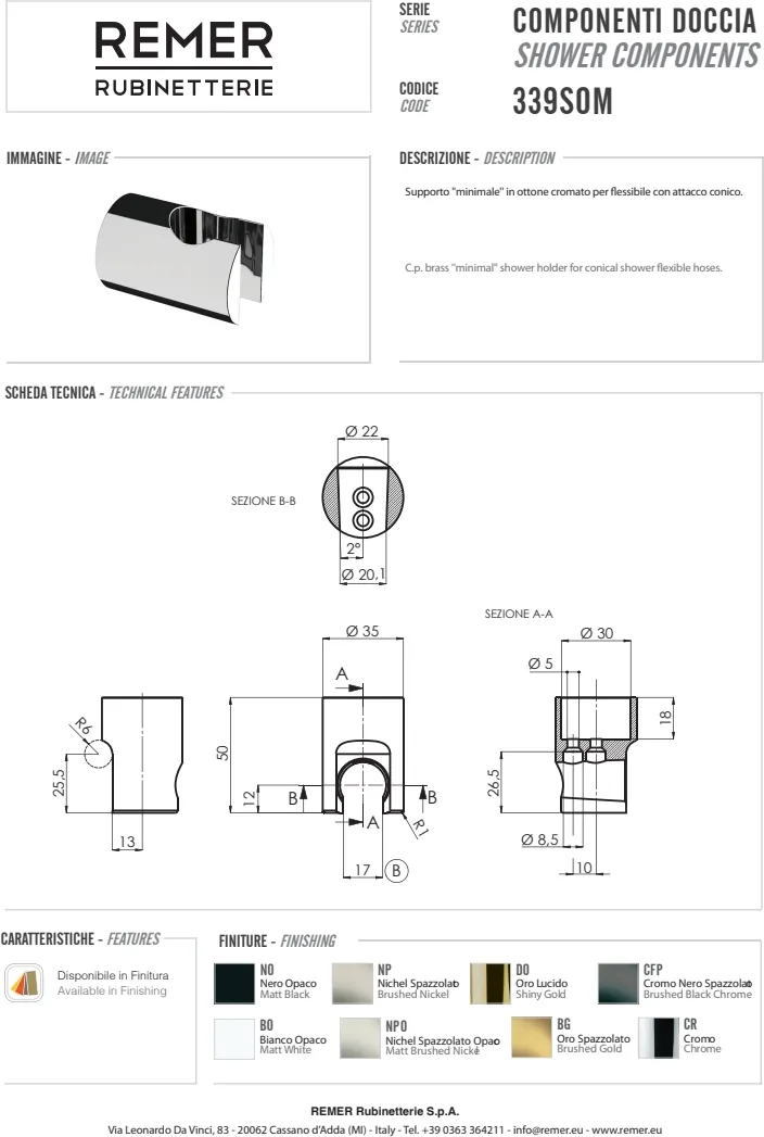 Итальянский бренд Remer Rubinetterie более 50 лет специализируется на выпуске смесителей, душевых систем и аксессуаров для ванной комнаты и кухни. Главная особенность продукции Remer — сочетание классического итальянского дизайна и современных технологий. В отличие от многих конкурентов, компания выпускает полный цикл изделий: от литейного производства латунных корпусов до хромирования и финальной сборки. Это обеспечивает стабильное качество, долговечность и оптимальную цену для европейской сантехники премиум-класса.