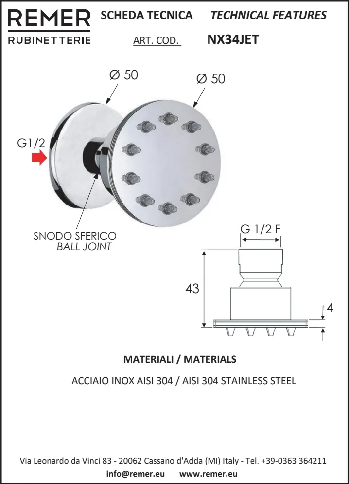 Round body jet in stainless steel mirror polished for shower systems, antilimestone, with ball-joint, O cm 5