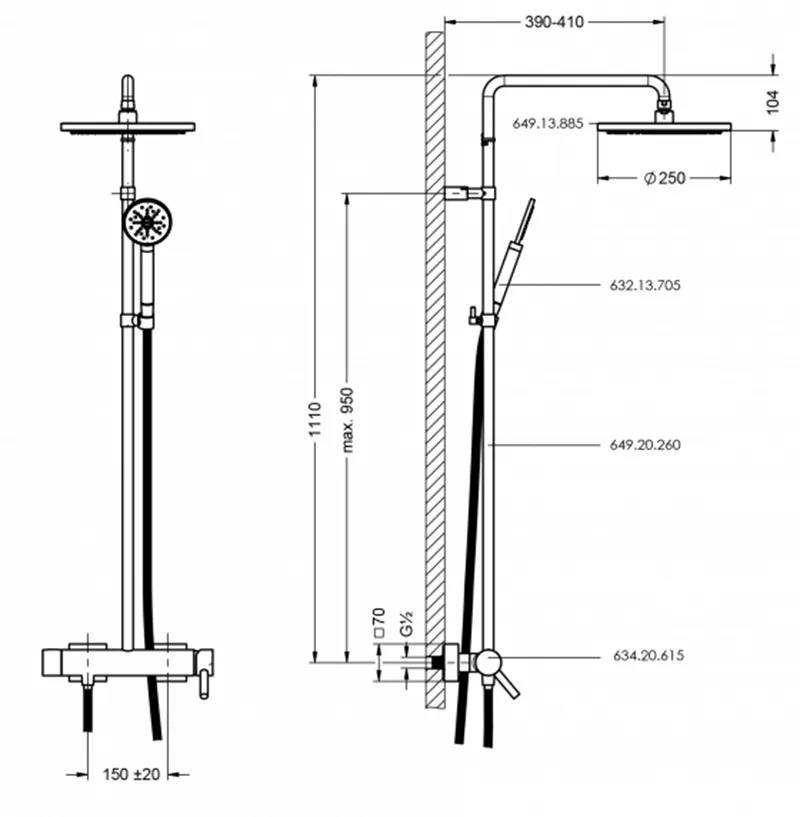 Потолочное подсоединение или настенный держатель для душа заказывается отдельно.