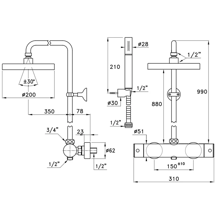Душевой комплект Stella Bamboo 3287/304-200: термостатический смеситель, штанга+ручной+верхний душ 200 хром UN 02610 CR00