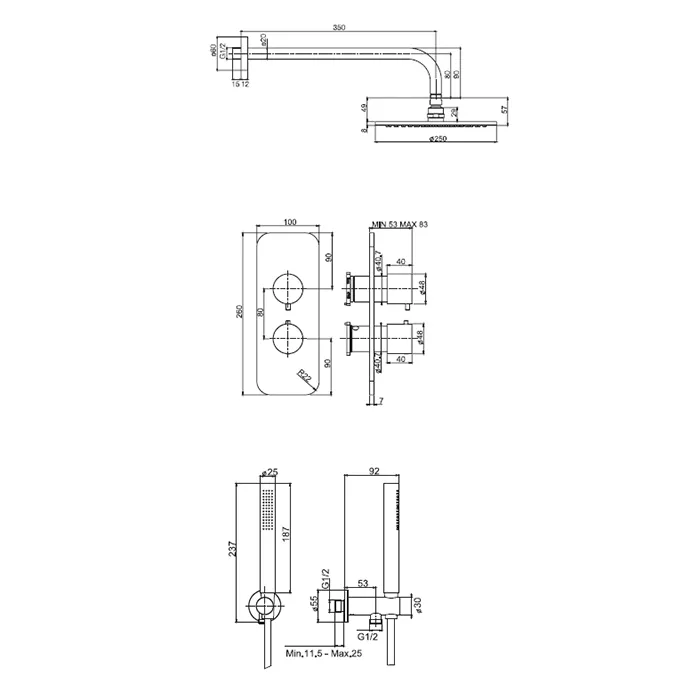 Душевой комплект с верх душем Fima Carlo Frattini Wellness 250, наст держ 350, душ компл, смес встр с пер на 2/3 источн, внутр часть, хром F4409CR