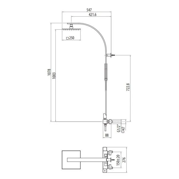 Комплект для душа Gattoni Kubik термостатический еситель, душевая стойка, душевая лейка 200, ручной душ, хром KIT/TS25C0