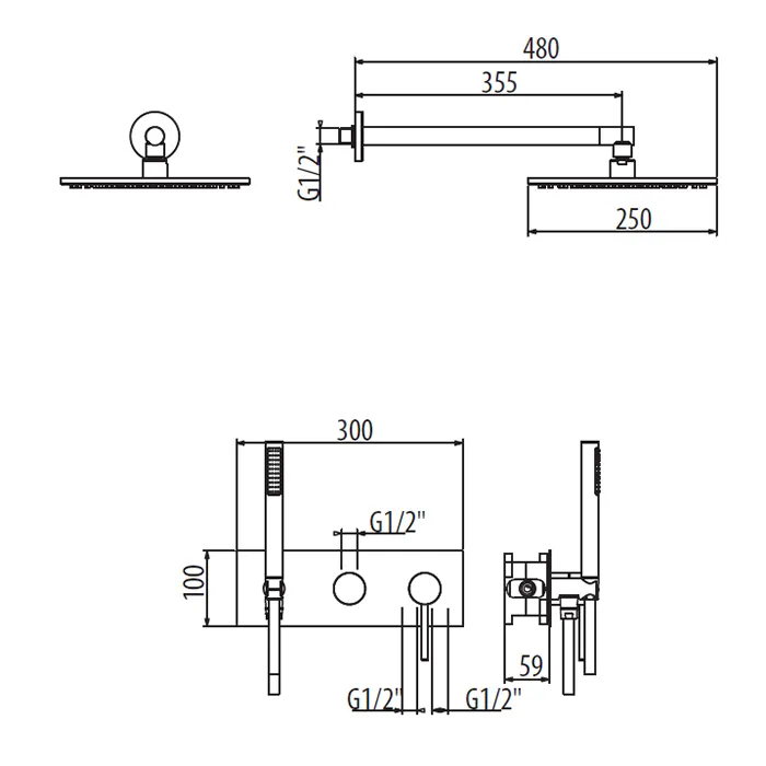 Комплект для ванны со смесителем двстроенным Gattoni Circle One на 2 вых, ручной лейкой и верхним душем 250, хром 9070/PDC0