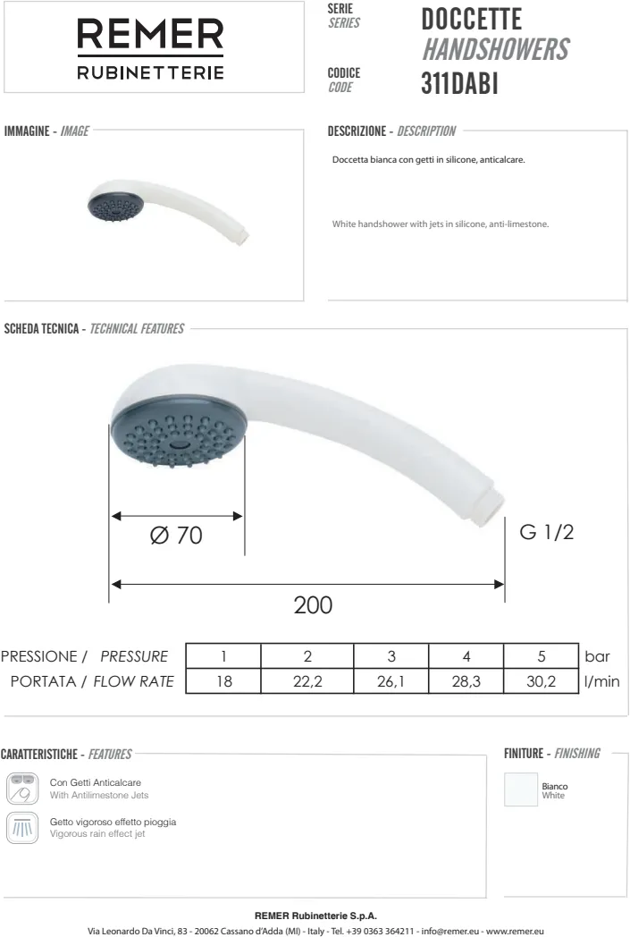 Ручной душ Remer белый пластик Ø 70мм 311DABI