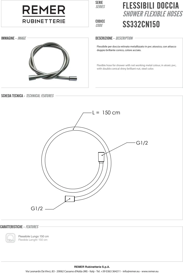 Шланг для душа Remer ПВХ 150см (цвет "нержавейка") к-к SS332CN150
