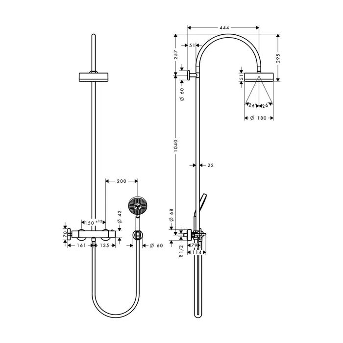 Axor Citterio Душевая стойка с термостатом, верхним душем Ø180мм, 1jet, шлангом и ручным душе