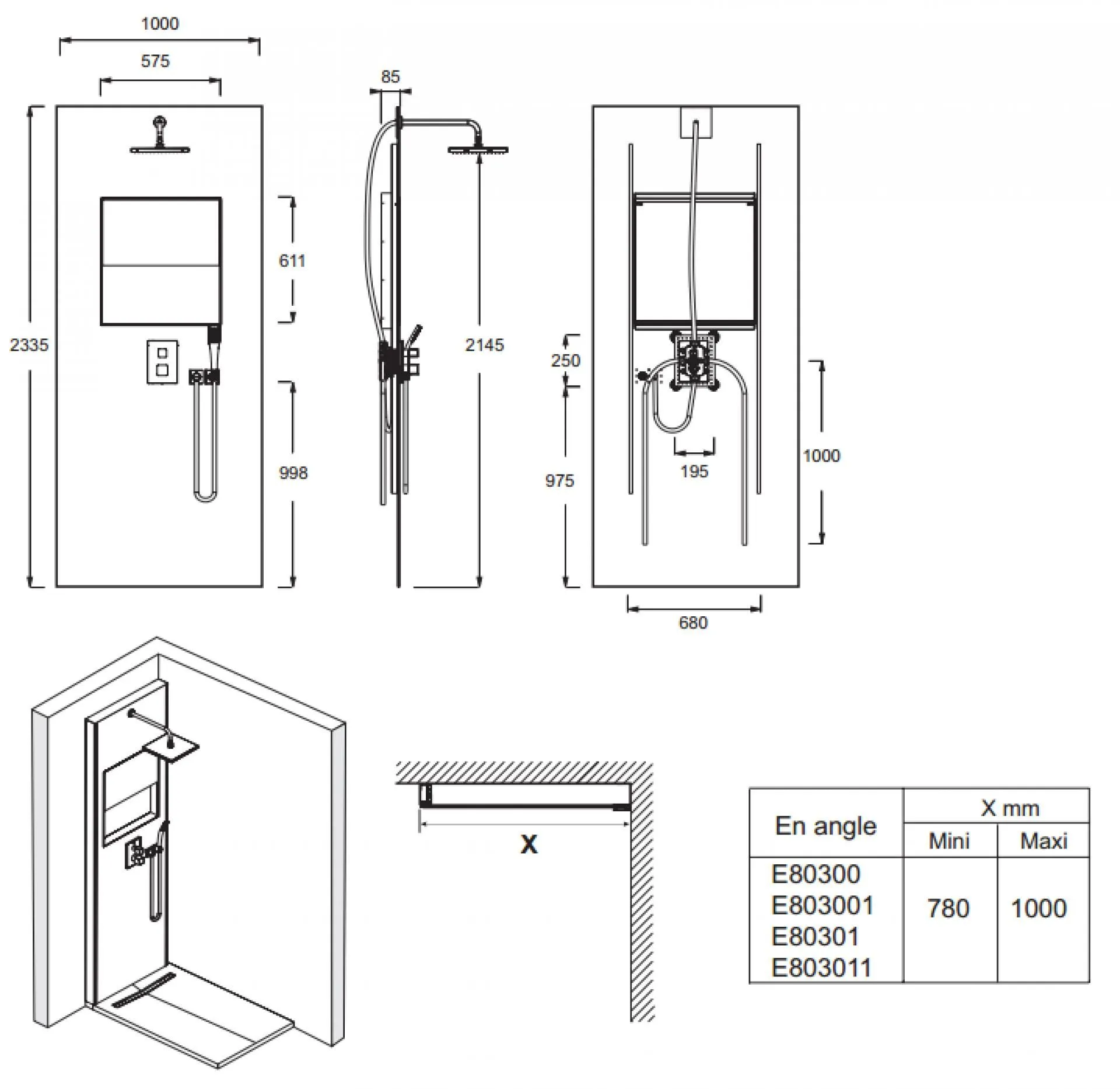 Душевая система с термостатом и квадратным верхним душем Jacob Delafon Ecrin E803001-D35, с подсветкой