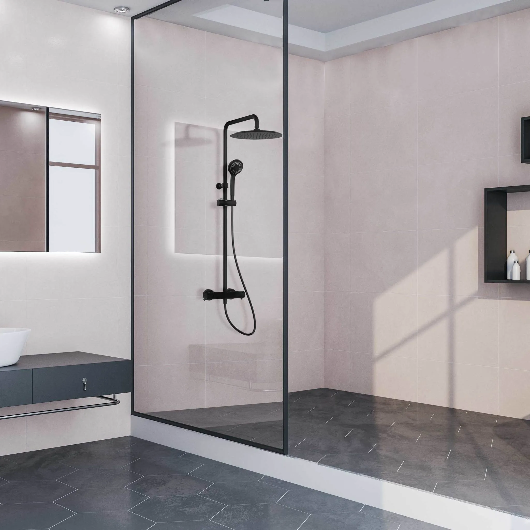 Откройте для себя непревзойдённый комфорт и стиль с душевой системой Ramonsoler Blautherm. Эта термостатическая душевая система без излива, с регулировкой высоты, выполненная в элегантном чёрном цвете, станет настоящим украшением вашей ванной комнаты.