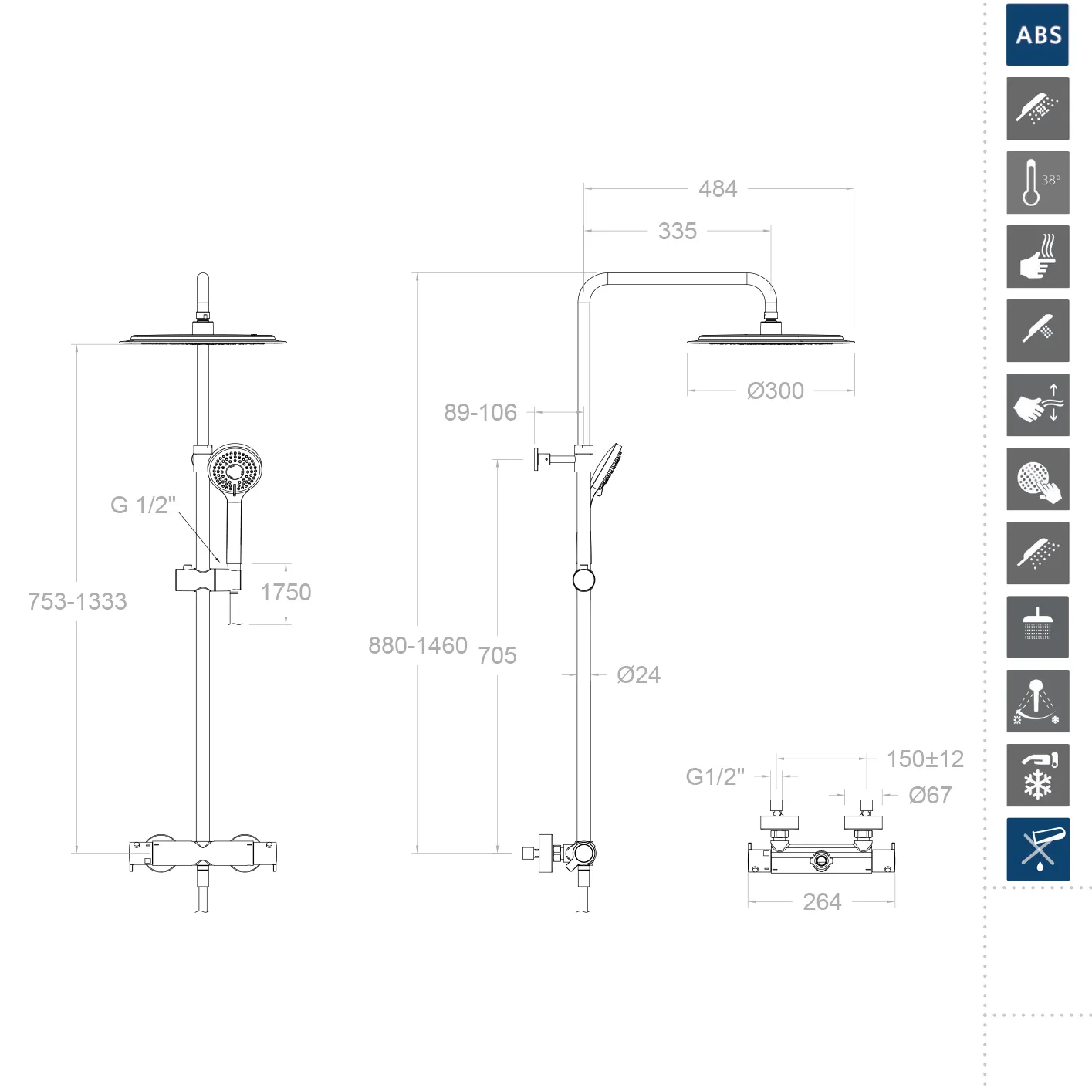 Душевая система Ramonsoler Blautherm термостатическая без излива с регулировкой высоты чёрный 945401RP300NM