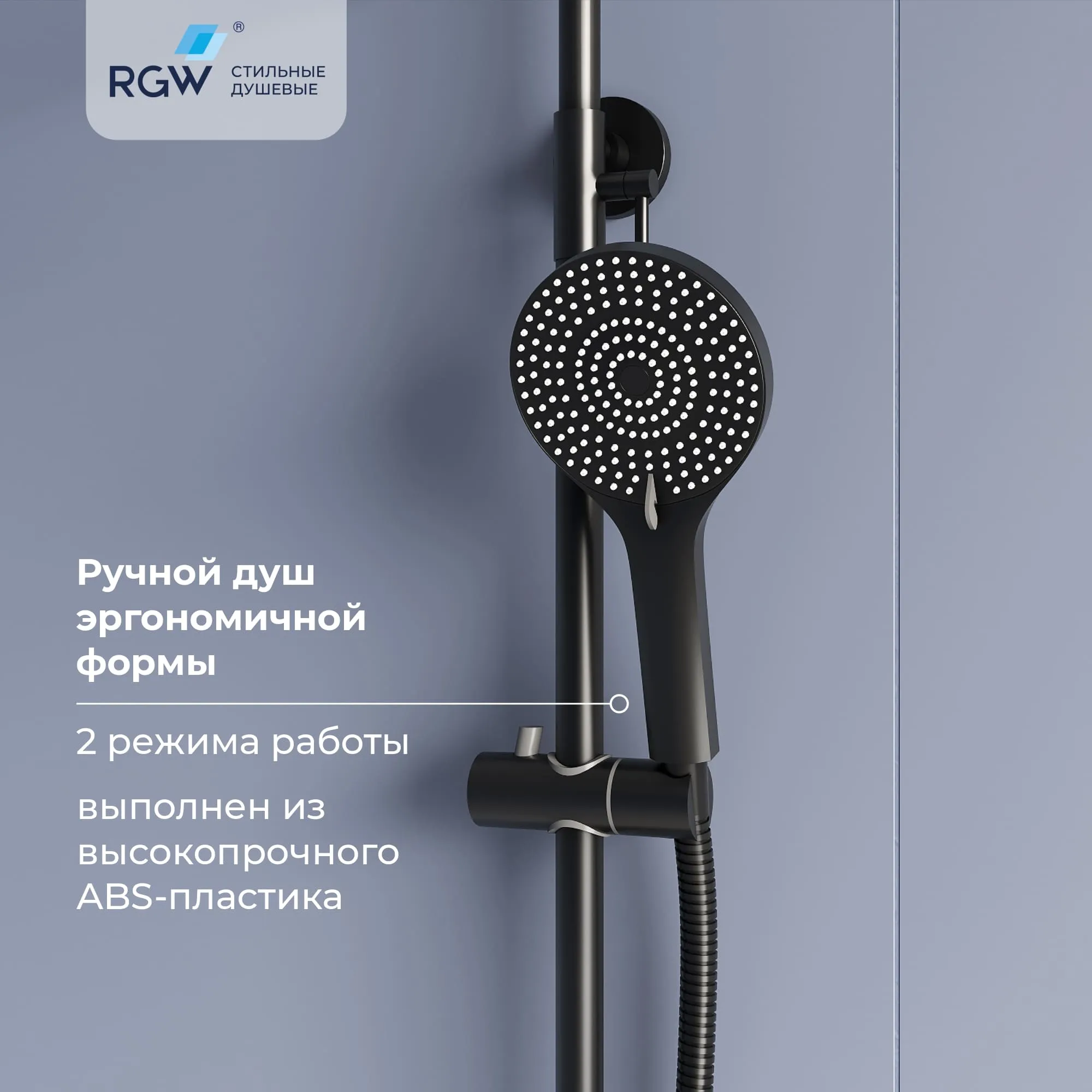 - Головной душ выполнен из высокопрочного ABS-пластика и оснащён шарнирным креплением, что позволяет выбрать необходимый угол направления воды