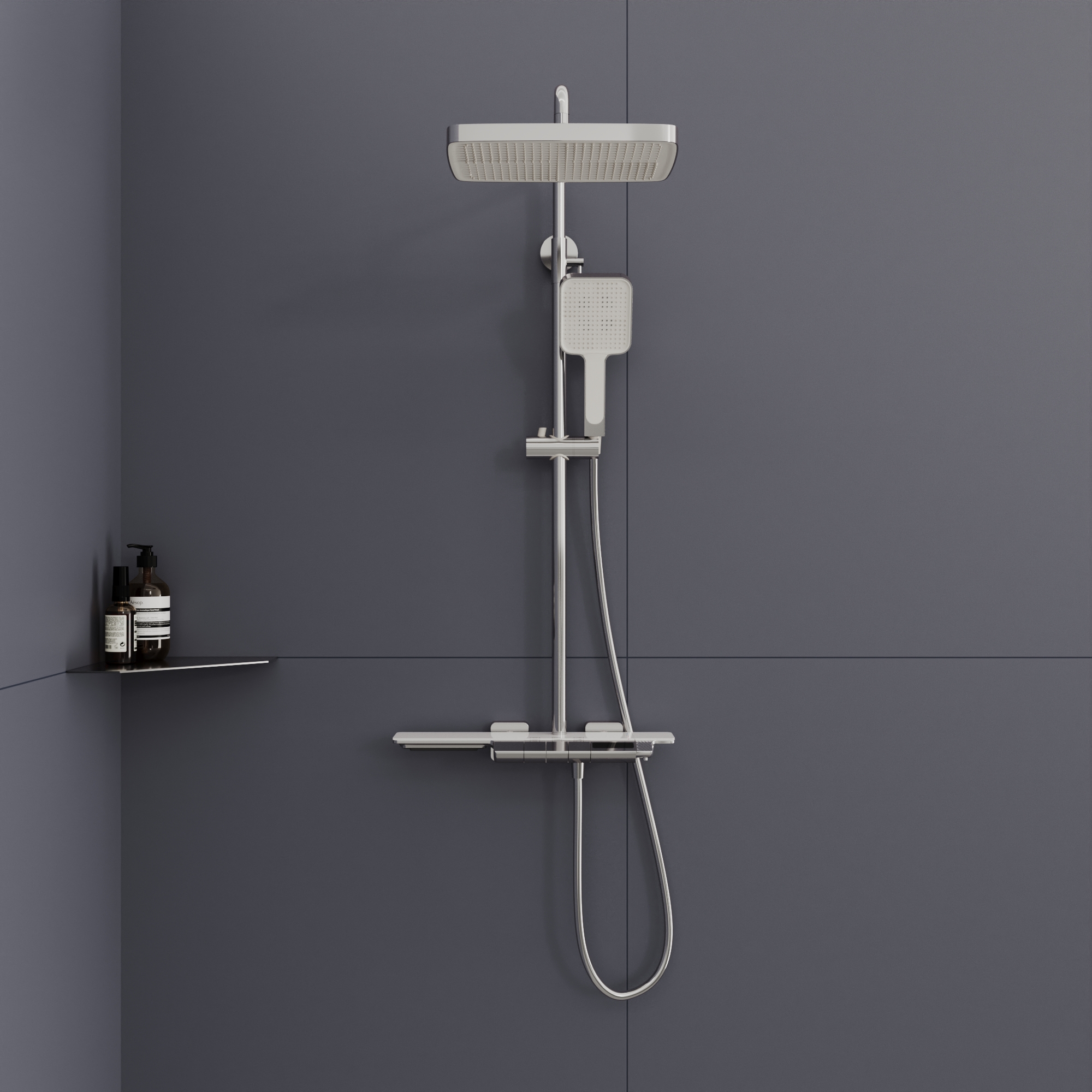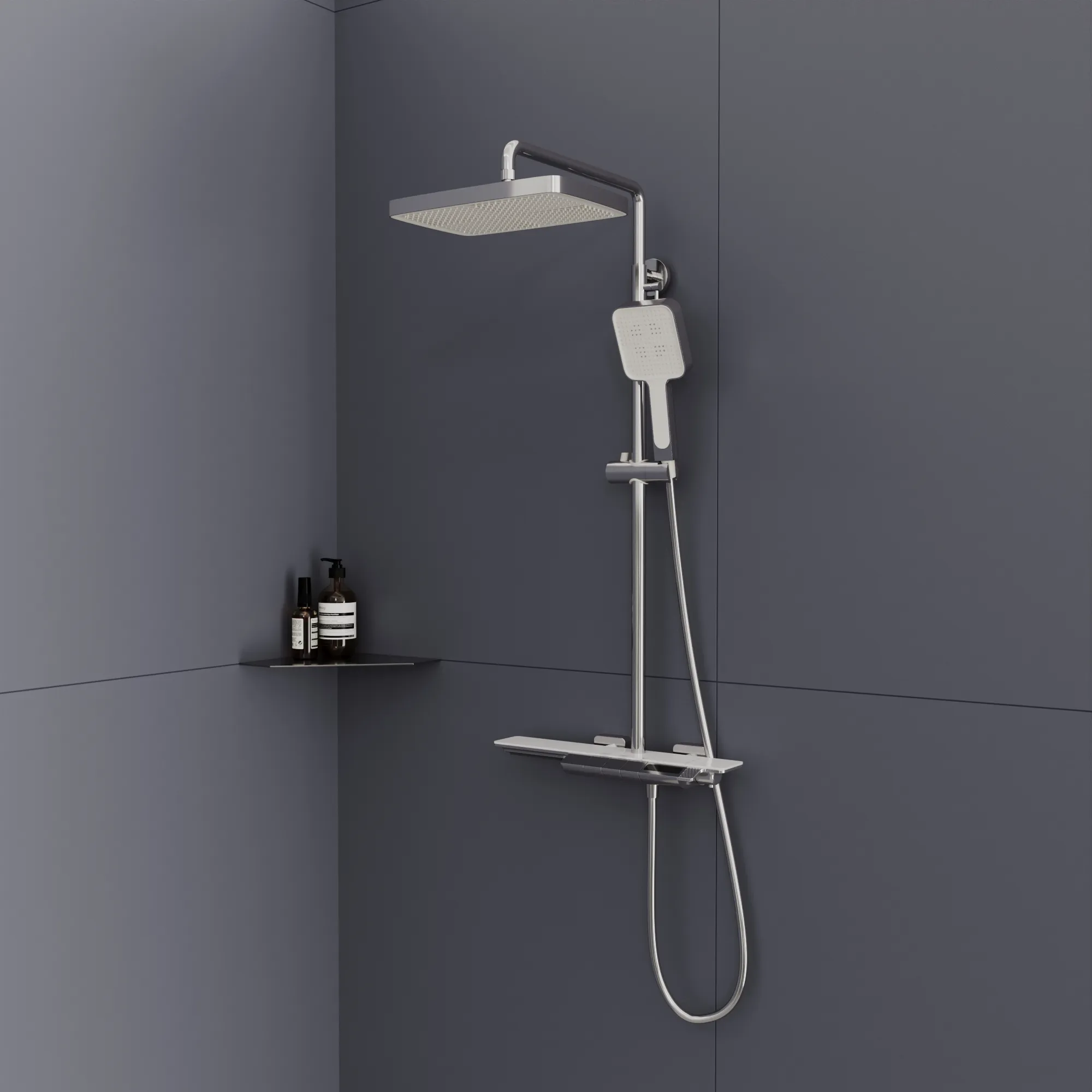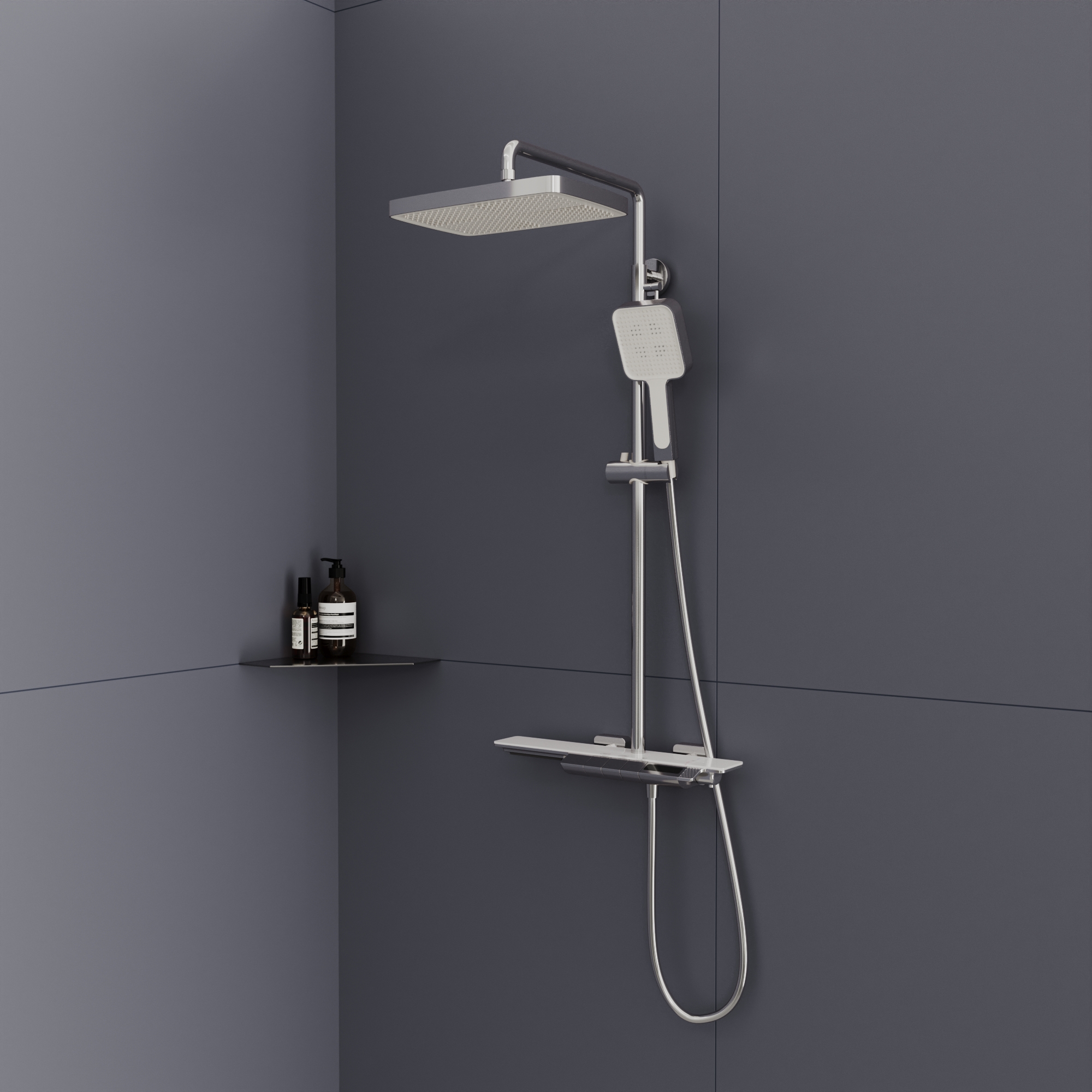 - Вместительная стеклянная полка для душевых принадлежностей;