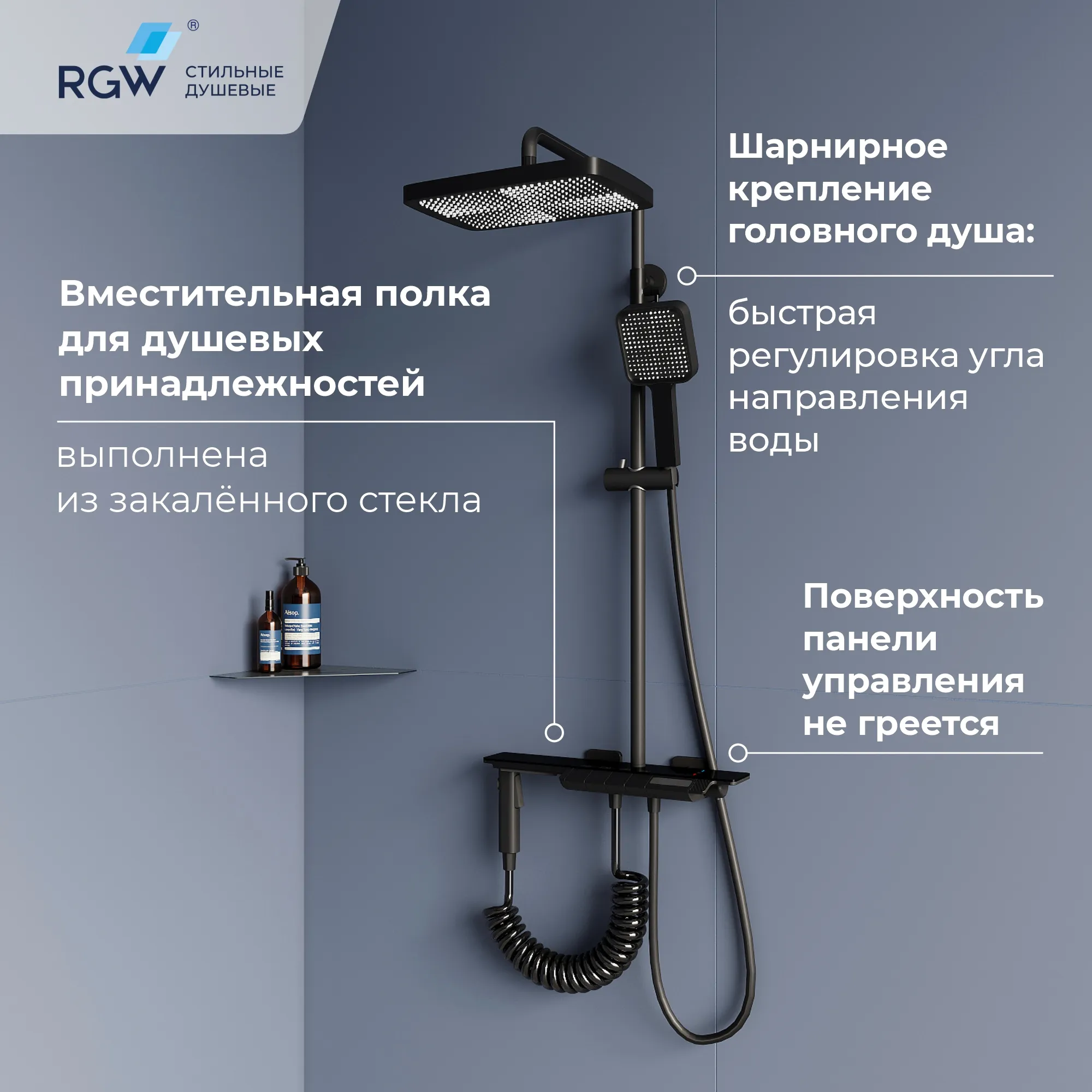Вместительная стеклянная полка для душевых принадлежностей;