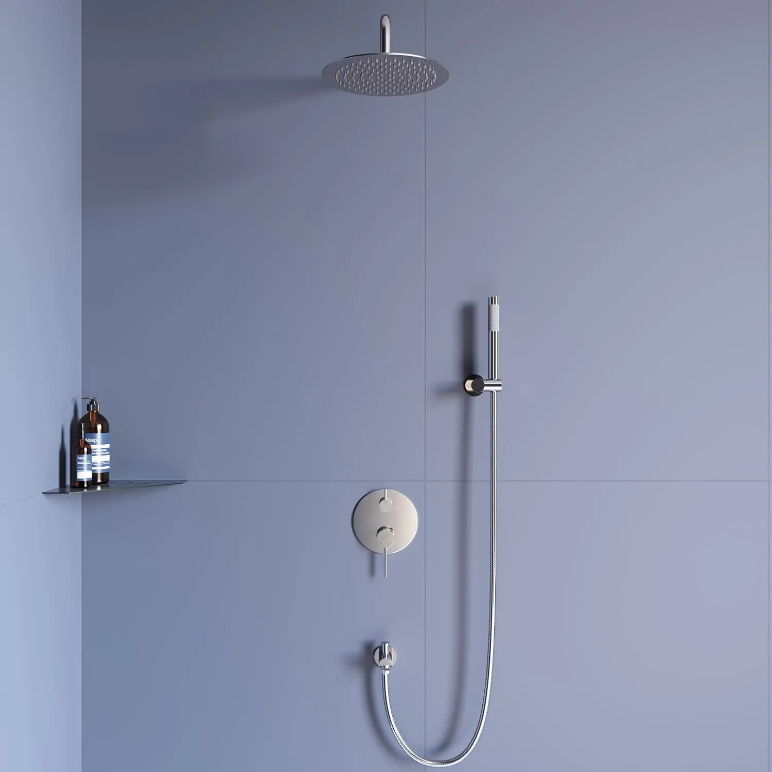 Преимущество встраиваемой системы заключается в том, что основная функциональная часть спрятана в стену, что позволяет значительно увеличить пространство в душевой зоне.
