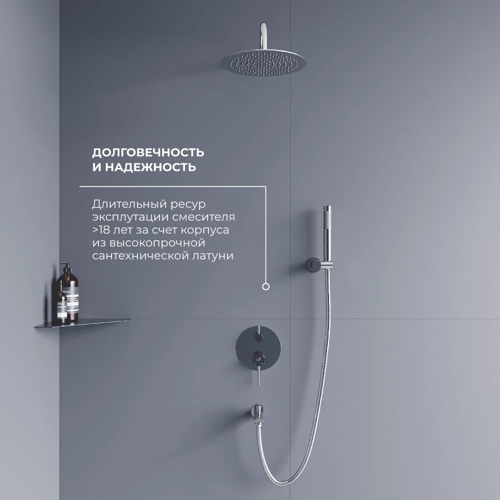 Встраиваемая душевая система выполнена из латуни и нержавеющей стали, что придаёт изделию повышенную устойчивость к образованию коррозии и ржавчины, а внутренний элемент оснащён керамическими пластинами. За счет применения передовых технологий душевые системы рассчитаны на ресурс эксплуатации не менее 10 лет.