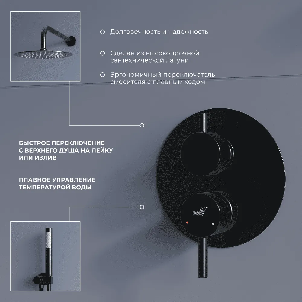 Душевые системы RGW с верхним душем гармонично вписываются в интерьер любой ванной комнаты за счет современного дизайна и продуманной эргономики.