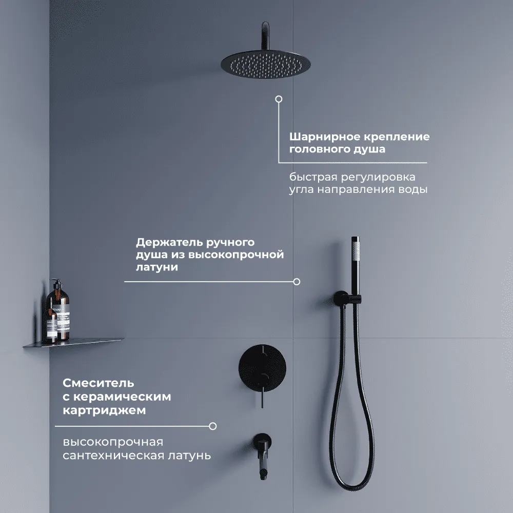 Встраиваемая душевая система выполнена из латуни и нержавеющей стали, что придаёт изделию повышенную устойчивость к образованию коррозии и ржавчины, а внутренний элемент оснащён керамическими пластинами. За счет применения передовых технологий душевые системы рассчитаны на ресурс эксплуатации не менее 10 лет.