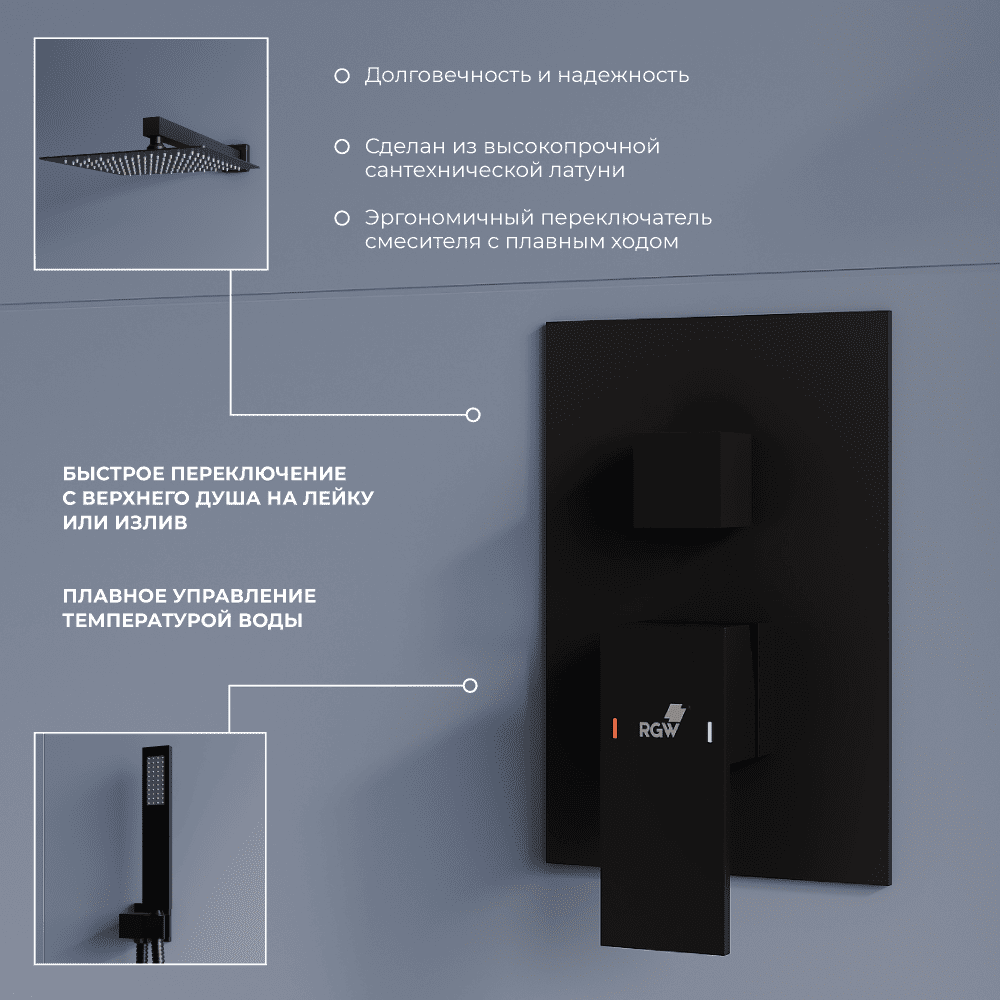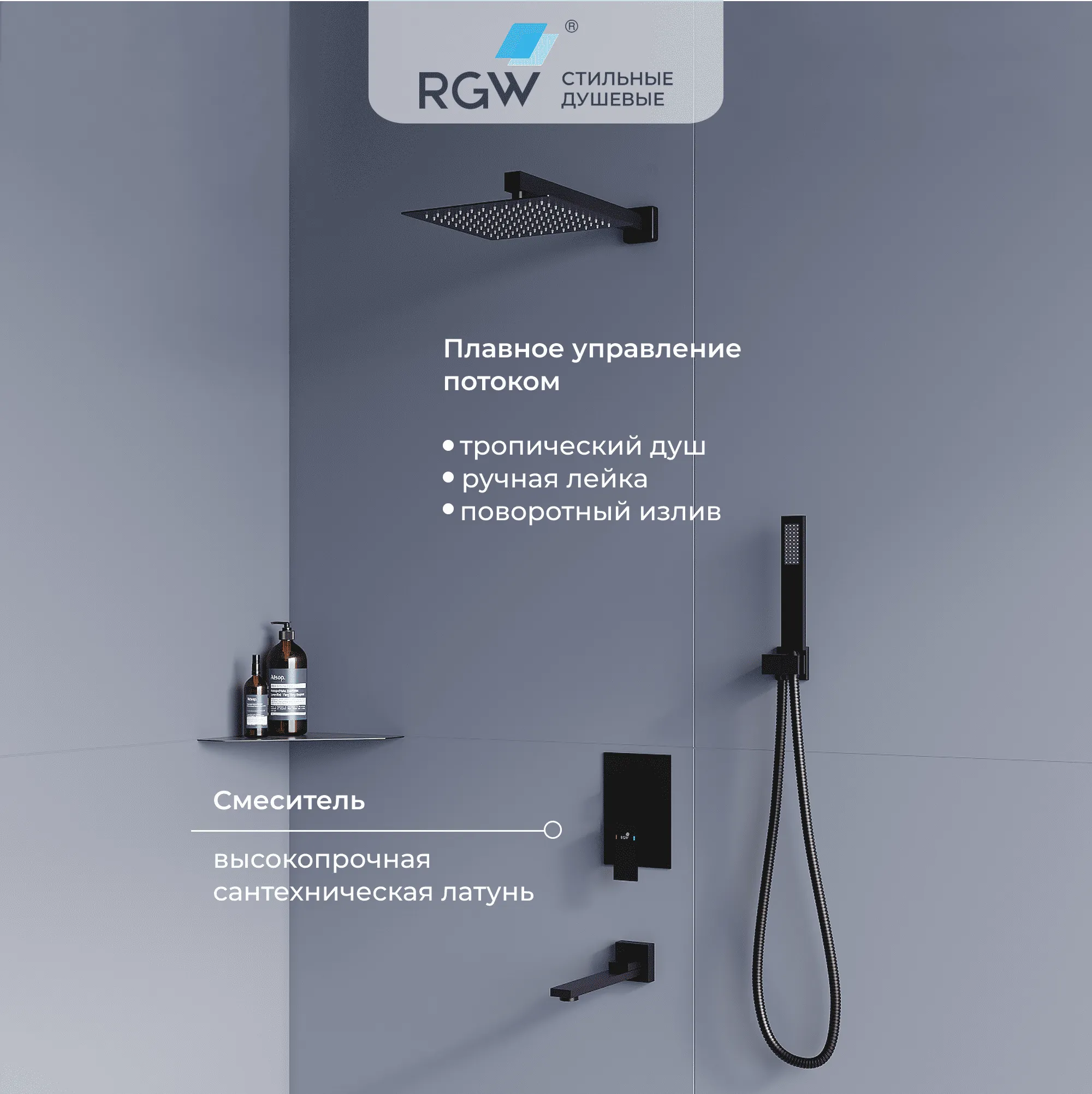 Душевые системы RGW с верхним душем гармонично вписываются в интерьер любой ванной комнаты за счет современного дизайна и продуманной эргономики.