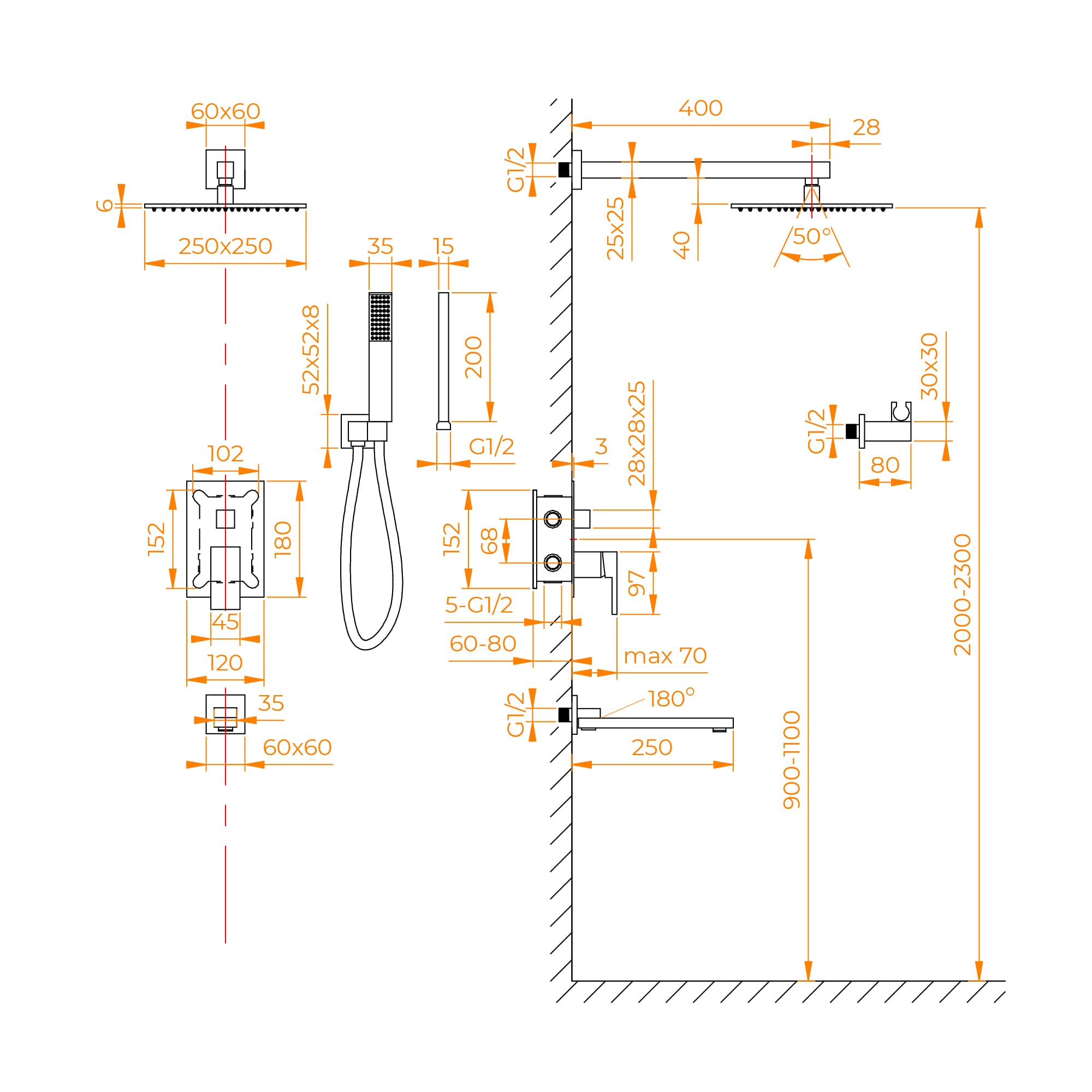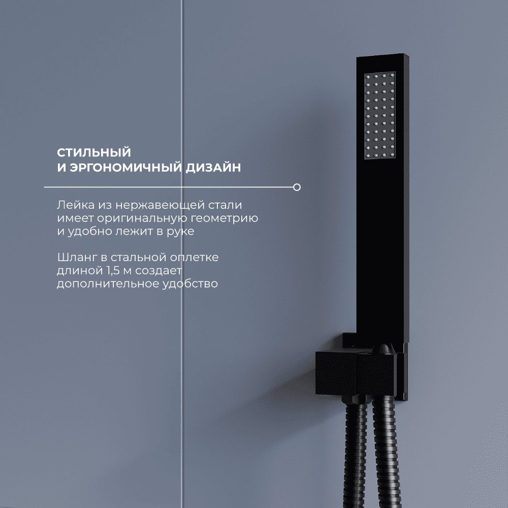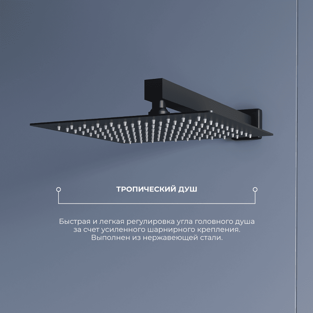 - Головной душ, горизонтальный держатель из нержавеющей стали. Головной душ оснащён шарнирным креплением, что позволяет выбрать необходимый угол направления воды