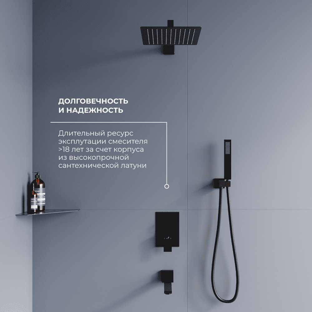 Встраиваемая душевая система выполнена из латуни и нержавеющей стали, что придаёт изделию повышенную устойчивость к образованию коррозии и ржавчины, а внутренний элемент оснащён керамическими пластинами. За счет применения передовых технологий душевые системы рассчитаны на ресурс эксплуатации не менее 10 лет.