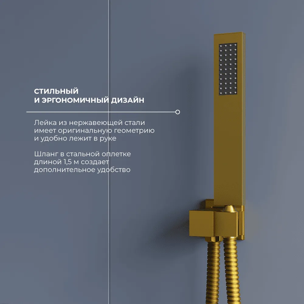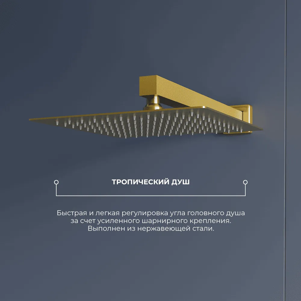 - Головной душ, горизонтальный держатель из нержавеющей стали. Головной душ оснащён шарнирным креплением, что позволяет выбрать необходимый угол направления воды