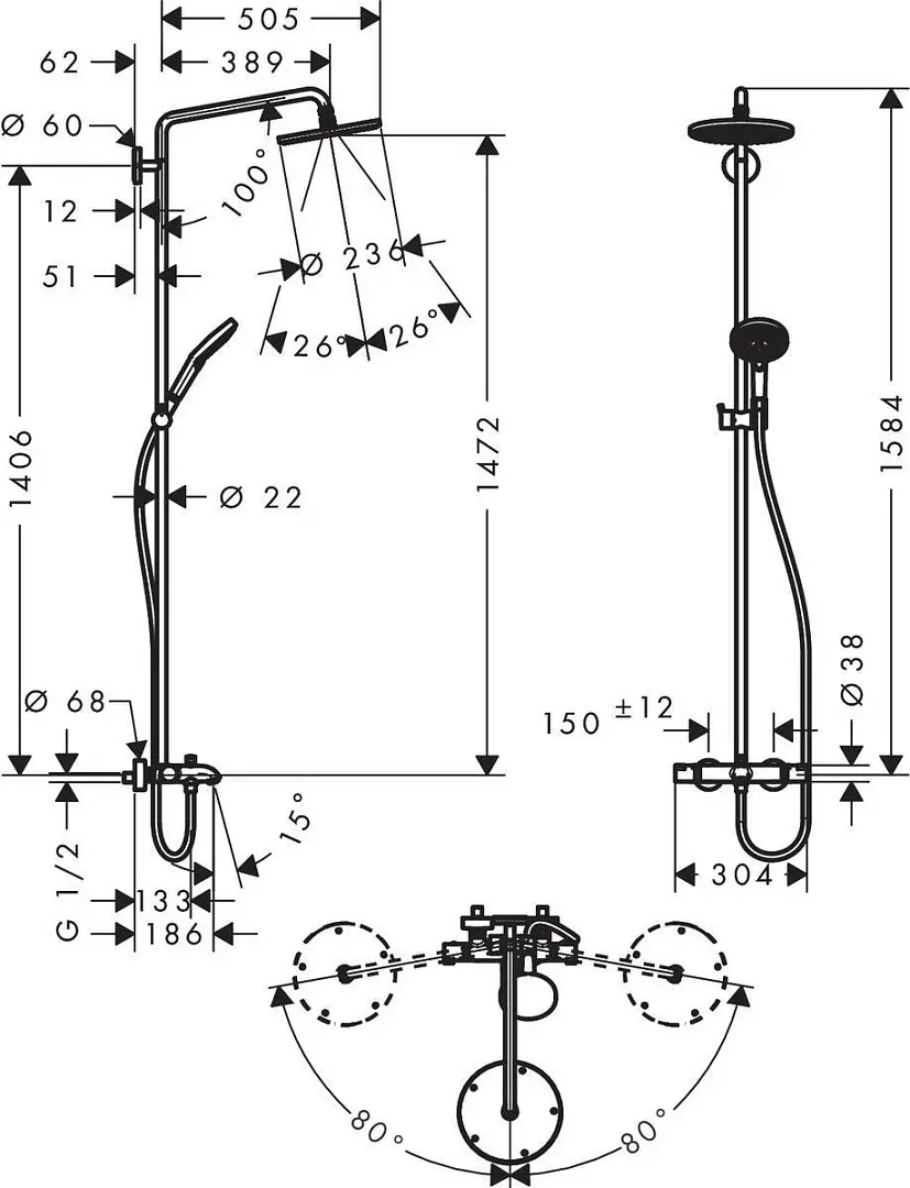 Душевая система для ванны с поворотным держателем верхнего душа 450 мм, 1/2 ’, ручным душем и верхней лейкой