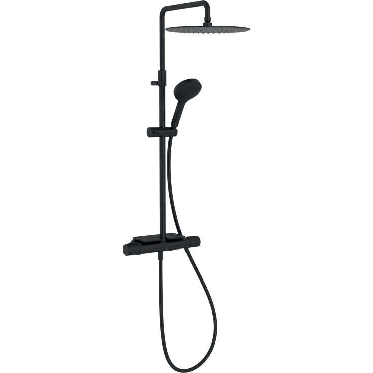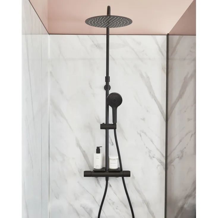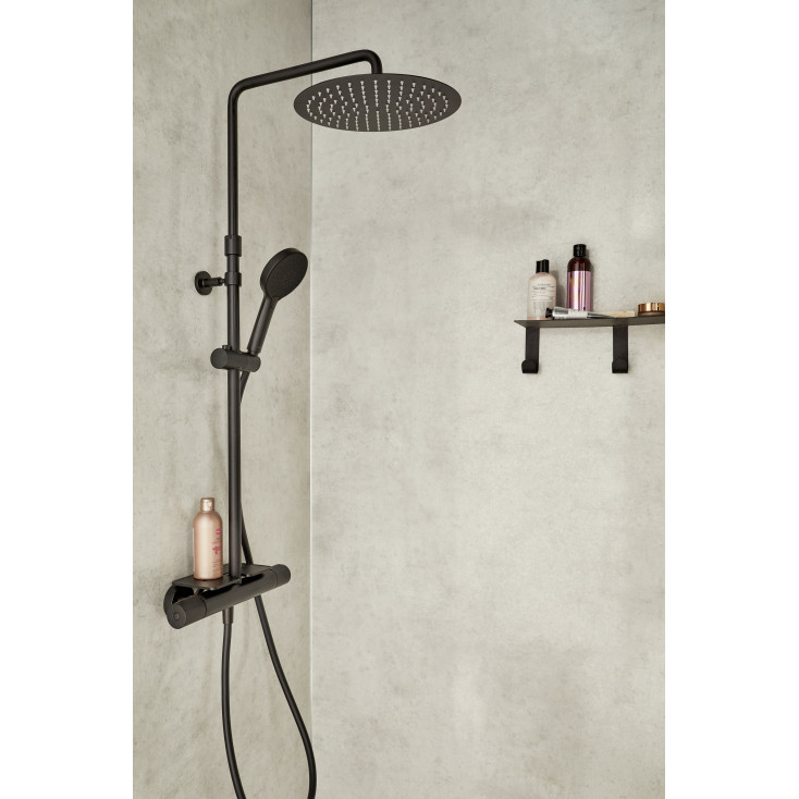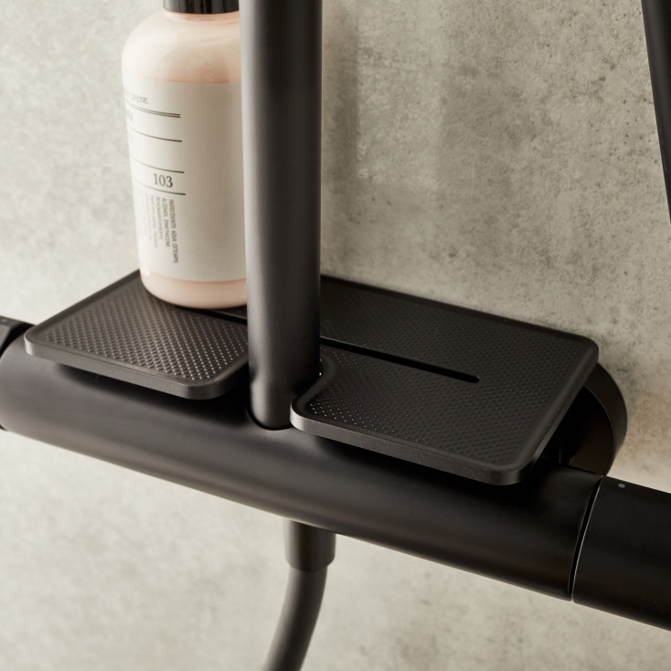 Душевая стойка Jacob Delafon Metro E26589-BL. Верхний ультратонкий душ с 1 режимом струи и антиизвестковым покрытием. Лейка для ручного душа имеет 3 режима работы, которые меняются с помощью кнопки на лейке. Горячая вода в задней части смесителя и ограничение температуры 50°C. Блокирование потока воды при отключении холодной воды. Полка с противоскользящим покрытием для хранения аксессуаров. Высота: 128,3 см. Ширина: 33,5 см. Длина: 58,5 см. Размер верхнего душа: 30 см. Места соединений шланга с лейкой и смесителем оснащены поворотным конусом или специальными подшипниками, которые препятствуют перекручиванию шланга. С термостатическим картриджем. Защита от обратного потока обеспечивается встроенным клапаном, препятствующим стоку воды обратно в трубопровод. Специальное покрытие внутри устройства предотвращает образование извести и скопление загрязнений. Можно отрегулировать по высоте положение отдельных частей стойки.