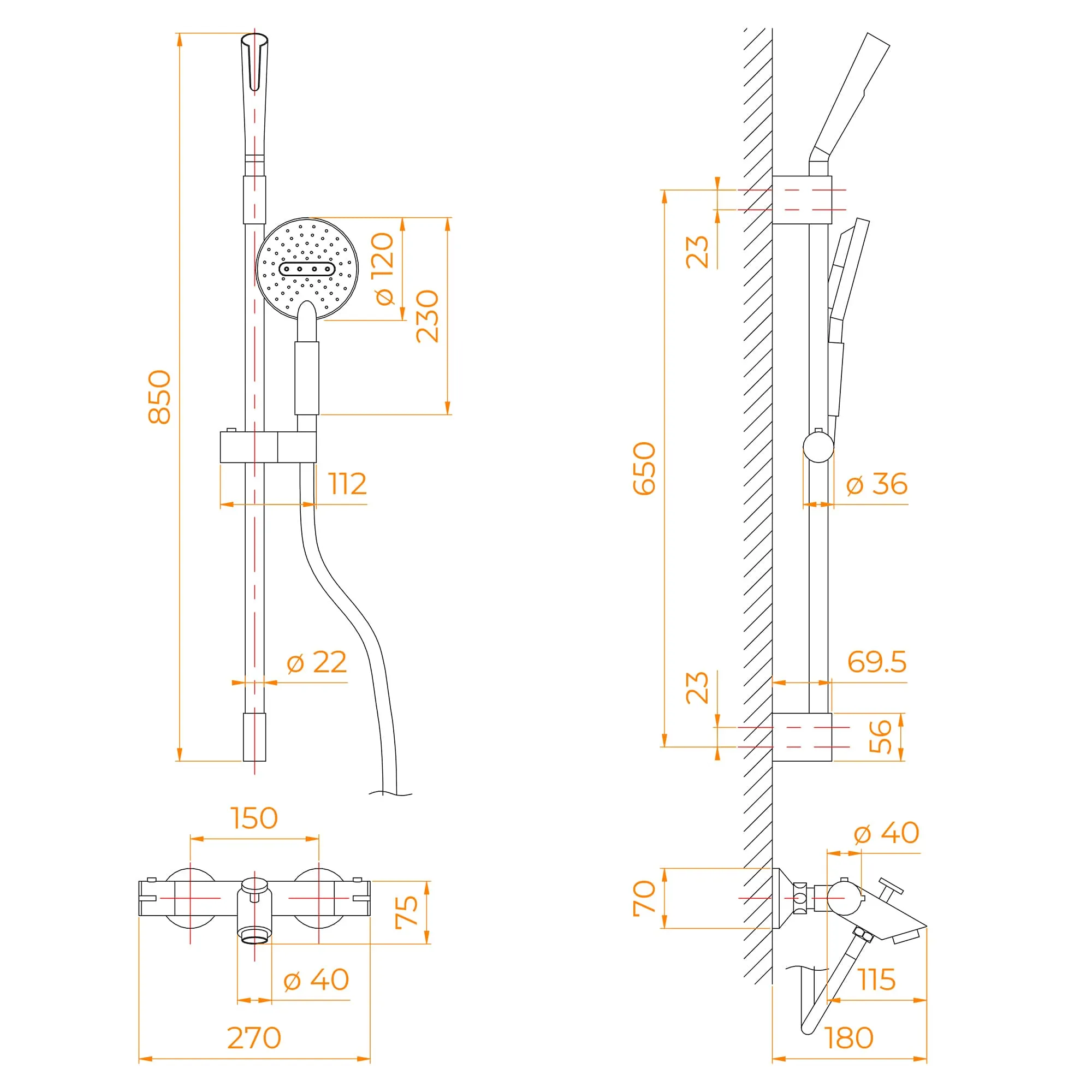 - Штанга диаметром 22 мм из нержавеющей стали AISI 304, с верхним креплением лейки в позицию головного душа. Также предусмотрена возможность регулировки высоты ручного потока лейки для удобства использования.