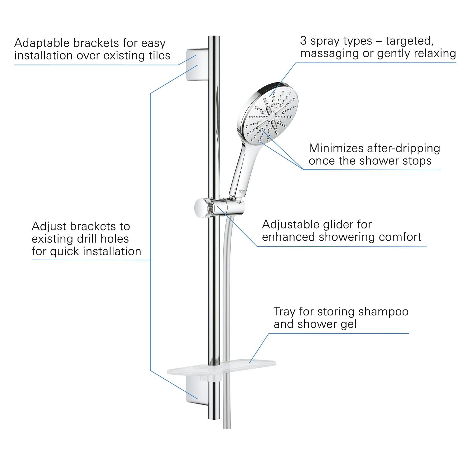 Душевые системы Grohe разработаны с учётом простоты установки. Многие модели оснащены системой QuickFix, которая упрощает монтаж и сокращает время установки.