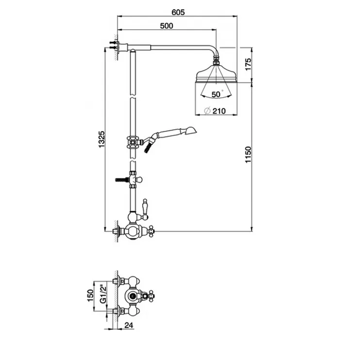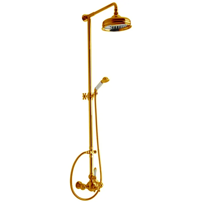 Душевой комплект Cisal Arcana Toscana термостатический смеситель, стойка с верхним душем, лейка+шланг, золото/белый TS00407024