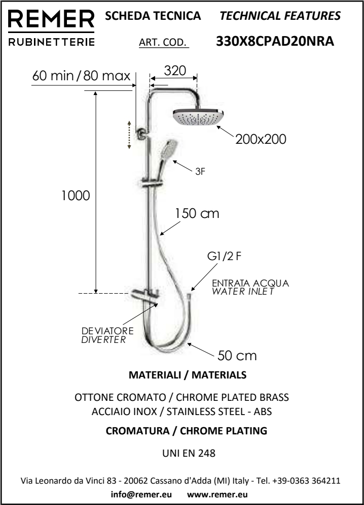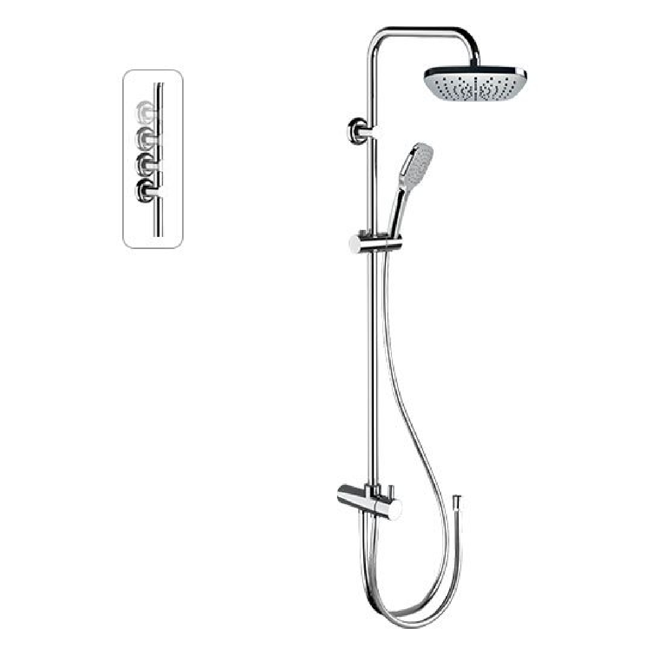 ДУШЕВОЙ КОМПЛЕКТ, including: shower column with height-adjustable wall fixing, diverter with water punch (330NRA), wall flexible hose 50 cm, 3 functions antilimestone ABS handshower with button to change jets (318CP), stainless steel 150 cm flexible hose and ABS antilimestone shower head 20x20 cm (356AD20).