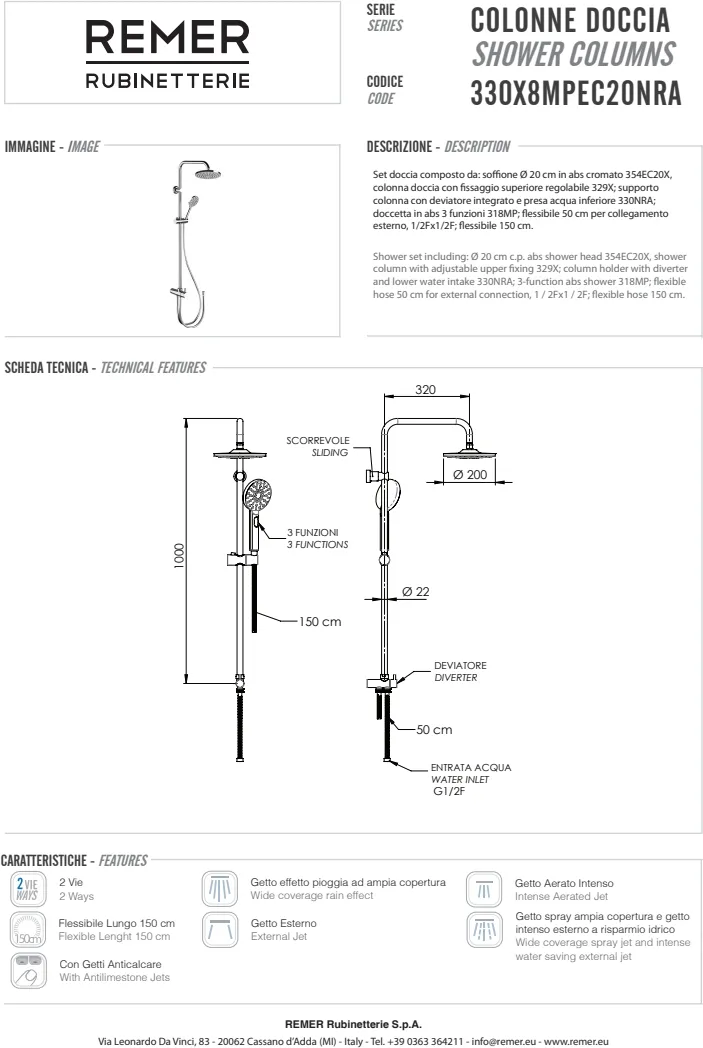 Shower set including: Ø 20 cm c.p. abs shower head 354EC20X, shower column with adjustable upper fixing 329X