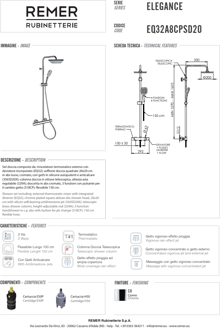 ELEGANCE thermostatic mixers collections is designed and manufactured by Remer Rubinetterie with great attention to detail, using high quality materials and advanced technologies, to always offer the best of comfort, safety and relaxation.
