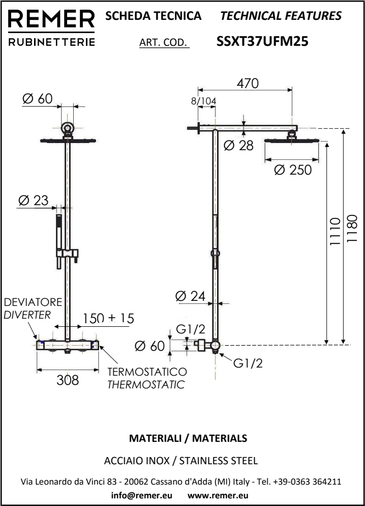 Душевая система Remer X-style inox с термостатом нержавеющая сталь SSXT37UFM25