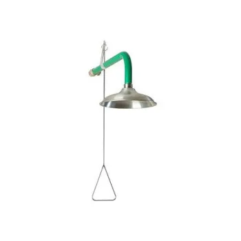 Настенный аварийный душ NOFER с ручным управлением, изготовленный из оцинкованной стали с зеленым эпоксидным покрытием и распылительной головкой из нержавеющей стали. Включает в себя полнопоточный клапан с мгновенным открытием и жесткую тягу для управления с помощью треугольной ручки.