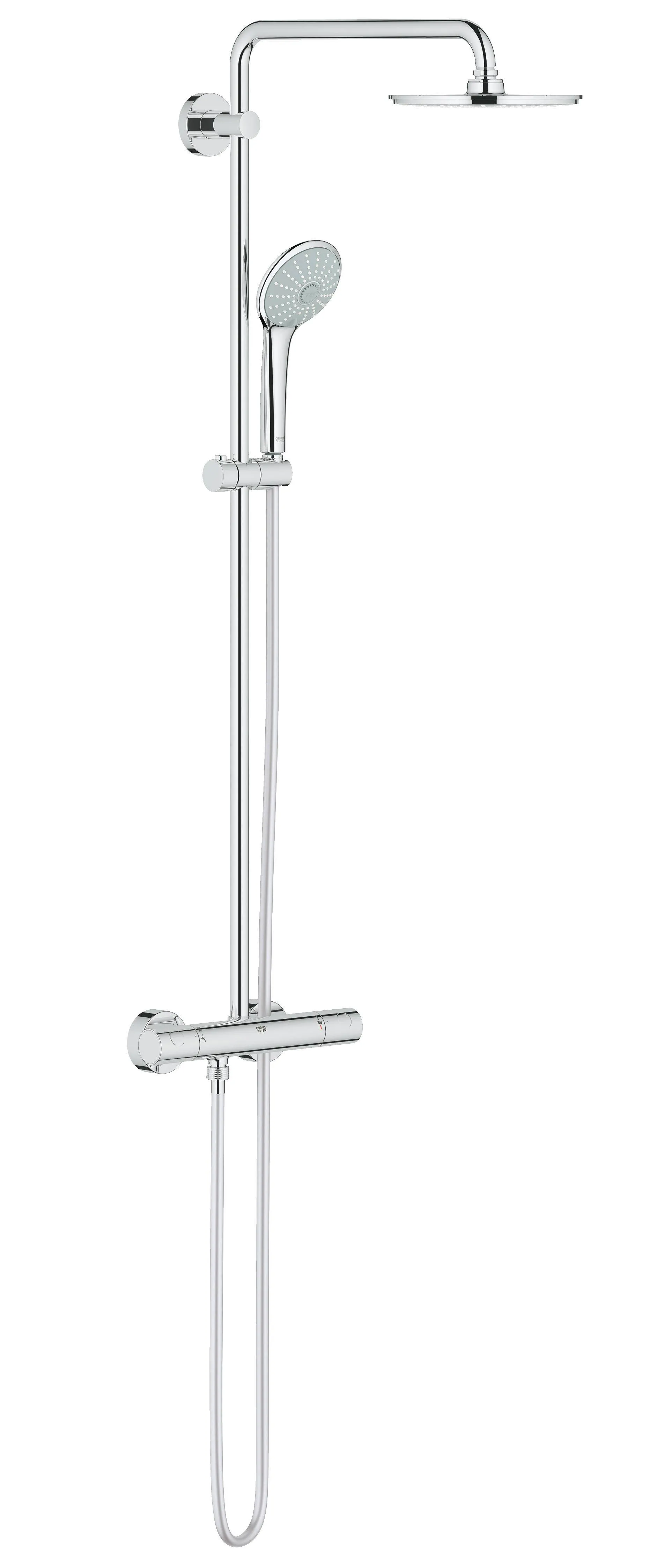 Душевая система с большим верхним душем подарит незабываемые ощущения от обволакивающего летнего дождя в режиме Rain. Ручной душ также предложит выбор между водосберегающим режимом SmartRain и живительным режимом Massage. Технология GROHE DreamSpray® обеспечивает равномерный поток из всех форсунок. Благодаря системе DropStop душ больше не будет капать после выключения. Спроектированный с применением технологии GROHE TurboStat® термостат непрерывно поставляет воду заданной температуры для пользователя. Для вашей безопасности температура более 38°C может быть настроена только сознательно нажатием кнопки SafeStop и поворотом рукоятки. Это защитит вас и ваших детей от ожогов. Износостойкое хромовое покрытие GROHE StarLight®, в котором выполнена система, добавит дополнительной привлекательности вашей ванной комнате.