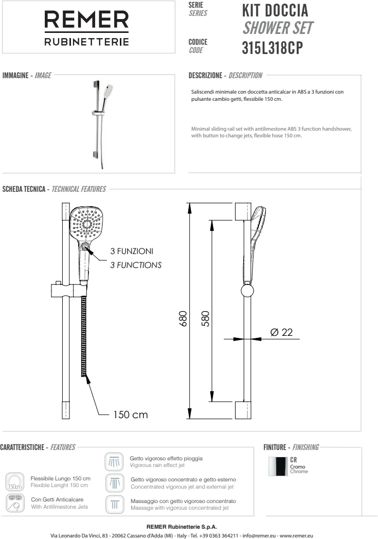 Душевая стойка Remer 58см Ø22мм с ручн. душем и шлангом 315L318CP