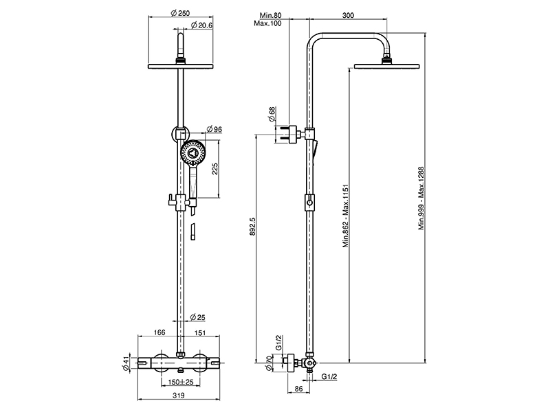 Смеситель на ванну FIMA CARLO FRATTINI F3154/RP259CR внешнего монтажа c душевой стойкой, верхним душем и душевым комплектом, цвет хром. Состав комплекта: механическая душевая штанга, регулируемая высота, 2 подвода воды 1/2 с эксцентриком, верхний душ из ABS Ø 250 мм, ручной душ ABS с защитой от извести анти-кальк, пластиковые ручки, переключатель, гибкий шланг хромалюкс 1500 мм.