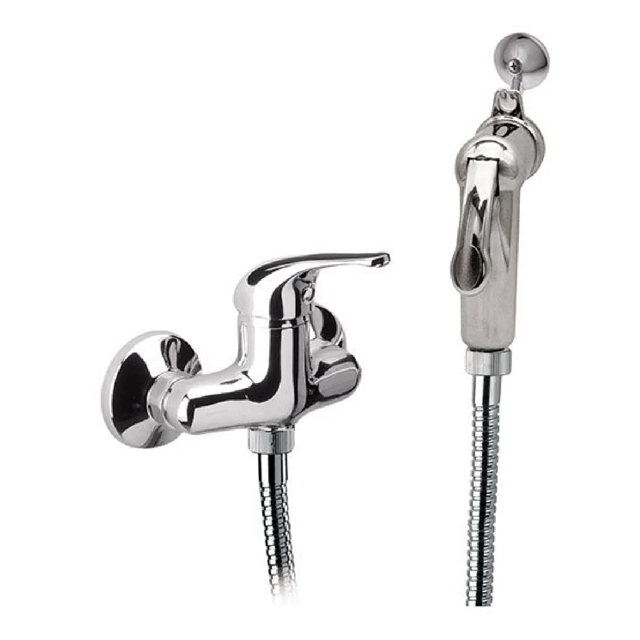 Смеситель однорычажный, межосевое расстояние 100, сдушевым комплектом shut-off из хромированного пластикаарт. 332DPCR, с душевым шлангом 120 см из хромированнойлатуни и крючком арт. 332 GA из хром. пластика.